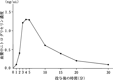 健康成人男子(N=10)にニトロペン舌下錠(ニトログリセリン0.3mg含有)を1錠ずつ舌下投与後の血漿中濃度を測定した結果、投与後4分で最高値に到達し、以後二相性で消失した2)。