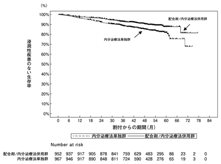 StageⅠ~ⅢBのエストロゲン受容体陽性かつHER2陰性で再発高リスク注6)の乳癌の術後患者注7)を対象に、テガフール・ギメラシル・オテラシルカリウム配合剤(以下、配合剤)と内分泌療法の併用群(979例)と内分泌療法単独群(980例)の有効性及び安全性を比較する無作為化非盲検比較試験を実施した。用法・用量はクレアチニンクリアランス及び体表面積に応じて、配合剤(FT60~120mg相当量/日)を1日2回、14日間連日経口投与後7日間休薬し、これを繰り返すこととされた。内分泌療法は、試験責任医師の選択する標準的な内分泌療法剤注8)を投与することとされた。いずれも再発又は投与中止基準に該当するまで、配合剤は最長1年間、内分泌療法は最長5年間継続することとされた。主要評価項目である浸潤性疾患のない生存期間のハザード比は0.61(95%信頼区間:0.47~0.80、ログランク検定 p=0.0002)であった31)。(2018年11月1日データカットオフ)注9)配合剤と内分泌療法の併用群の安全性解析対象とされた954例において、有害事象発現率は99.0%(944例)であった。主な有害事象は、白血球減少54.4%、色素沈着50.3%、ALT上昇42.9%、好中球減少42.0%、血中ビリルビン増加40.8%、疲労39.1%、AST上昇38.6%、貧血34.9%、悪心34.5%、下痢32.3%、血小板減少32.2%であった。