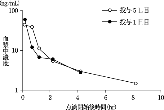 各種悪性腫瘍患者に、本剤1.0~1.5mg/m2/日を5日間連日点滴静脈内投与した時の5日目のCmax、AUC0-t、T1/2及びCLpには反復投与による明らかな変化は認められなかった2)。