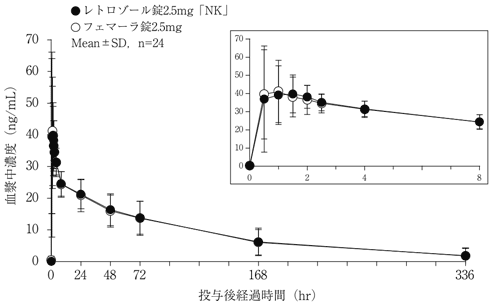 レトロゾール錠2.5mg「NK」とフェマーラ錠2.5mgを、クロスオーバー試験法によりそれぞれ1錠(レトロゾールとして2.5mg)閉経後健康成人女性に空腹時単回経口投与して血漿中レトロゾール濃度を測定した。得られた薬物動態パラメータ(AUC、Cmax)について90%信頼区間法にて統計解析を行った結果、log(0.80)~log(1.25)の範囲内であり、両剤の生物学的同等性が確認された5)。