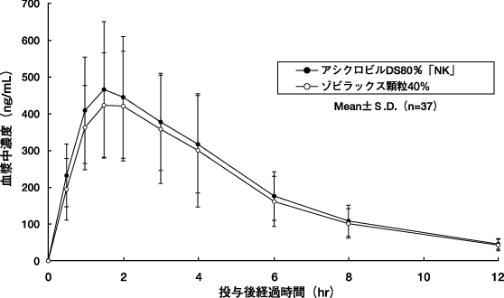 アシクロビルDS80%「NK」とゾビラックス顆粒40%それぞれアシクロビルとして200mgを、健康成人男子に絶食単回経口投与(クロスオーバー法)し、血漿中アシクロビル濃度を測定した。得られた薬物動態パラメータ(AUC、Cmax)について統計解析を行った結果、両剤の生物学的同等性が確認された7)。