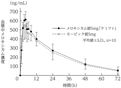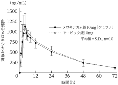 メロキシカム錠10mg「ケミファ」とモービック錠10mgを、クロスオーバー法によりそれぞれ1錠(メロキシカムとして10mg)健康成人男子に絶食単回経口投与して血漿中メロキシカム濃度を測定し、得られた薬物動態パラメータ(AUC、Cmax)について90%信頼区間法にて統計解析を行った結果、log(0.80)~log(1.25)の範囲内であり、両剤の生物学的同等性が確認された4)。