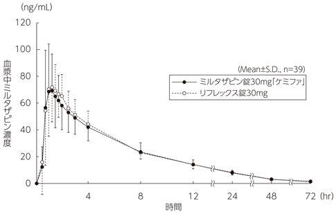 ミルタザピン錠15mg「ケミファ」は、「含量が異なる経口固形製剤の生物学的同等性試験ガイドライン」に基づき、ミルタザピン錠30mg「ケミファ」を標準製剤としたとき、溶出挙動が同等と判断され、生物学的に同等とみなされた7) 。