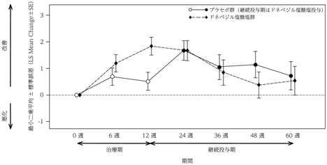 各評価時期(治療期及び継続投与期)におけるMMSEのベースラインからの変化量の推移本試験では、全般臨床症状に対するドネペジル塩酸塩の有効性がプラセボに比較して優れているという検証仮説は検証されていない。