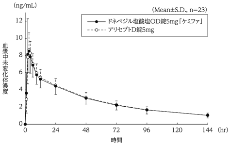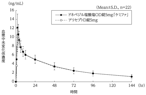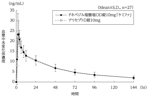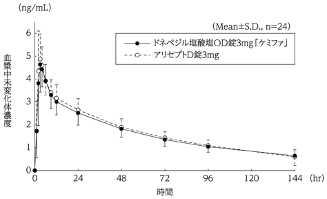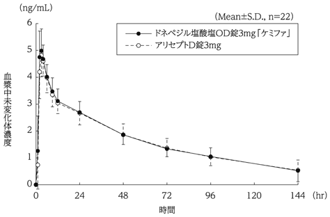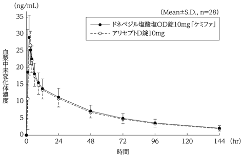 ドネペジル塩酸塩OD錠3mg「ケミファ」とアリセプトD錠3mgを、クロスオーバー法によりそれぞれ1錠(ドネペジル塩酸塩として3mg)健康成人男子に絶食単回経口投与(水なしで服用(n=24)及び水で服用(n=22))して血漿中未変化体濃度を測定し、得られた薬物動態パラメータ(AUC、Cmax)について90%信頼区間法にて統計解析を行った結果、log(0.80)~log(1.25)の範囲内であり、両剤の生物学的同等性が確認された3)。