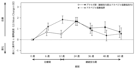 各評価時期(治療期及び継続投与期)におけるMMSEのベースラインからの変化量の推移本試験では、全般臨床症状に対するドネペジル塩酸塩の有効性がプラセボに比較して優れているという検証仮説は検証されていない。