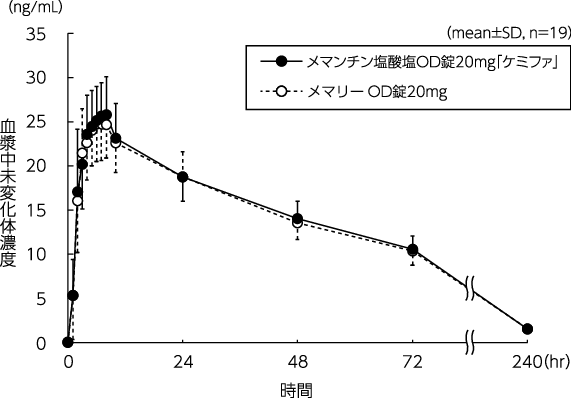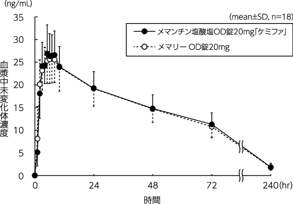 健康成人にメマンチン塩酸塩OD錠20mg(水なしで服用又は水で服用)又はメマンチン塩酸塩錠20mg(水で服用)をクロスオーバー法で空腹時単回経口投与したとき、いずれの場合も両製剤の血漿中濃度推移及び薬物動態パラメータは同様であった。メマンチン塩酸塩OD錠20mgは水なしで服用又は水で服用した場合のいずれも、メマンチン塩酸塩錠20mg(水で服用)と生物学的に同等であることが確認された3)。