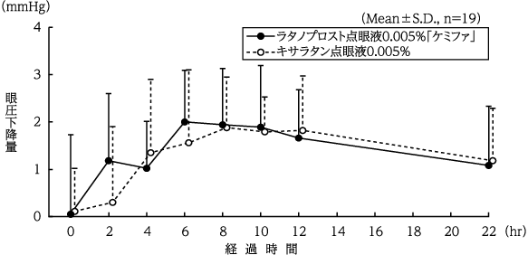 ラタノプロスト点眼液0.005%「ケミファ」とキサラタン点眼液0.005%をクロスオーバー法によりそれぞれ1滴 健康成人男子の両眼結膜嚢内に点眼して眼圧を測定し、得られたパラメータ(最大眼圧差※、眼圧下降※※-時間曲線下面積)について90%信頼区間法にて統計解析を行った結果、log(0.8)~log(1.25)の範囲内であり、両剤の生物学的同等性が確認された14)。※薬物投与前後における最大眼圧差※※同一被験者における観察期(投与前日・同時刻)と投与期の眼圧実測値の差