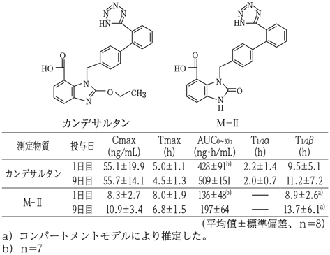 本態性高血圧症患者8例(38~68歳)に、1日1回4mgを朝食後に初回投与し、さらに1日休薬後連日7日間反復投与した時、いずれも血中には活性代謝物のカンデサルタン及び非活性代謝物M-Ⅱが検出されるが、未変化体はほとんど検出されない。1日目(初回投与後)及び9日目(7日間反復投与後)のカンデサルタンの血中濃度は投与4~6時間後にピークに達した後、徐々に低下する4)。