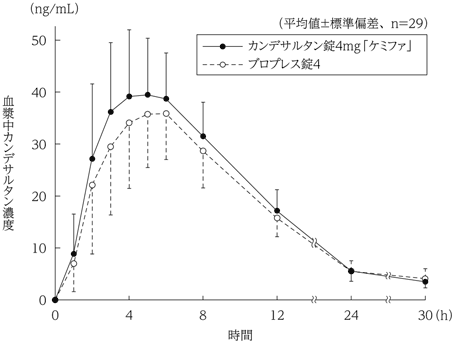 カンデサルタン錠12mg「ケミファ」とブロプレス錠12を、クロスオーバー法によりそれぞれ1錠(カンデサルタン シレキセチルとして12mg)健康成人男子に絶食単回経口投与して血漿中カンデサルタン濃度を測定し、得られた薬物動態パラメータ(AUC、Cmax)について90%信頼区間法にて統計解析を行った結果、log(0.80)~log(1.25)の範囲内であり、両剤の生物学的同等性が確認された6)。