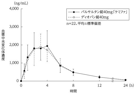 バルサルタン錠160mg「ケミファ」とディオバン錠160mgを、クロスオーバー法によりそれぞれ1錠(バルサルタンとして160mg)健康成人男子に絶食単回経口投与して血漿中未変化体濃度を測定し、得られた薬物動態パラメータ(AUC、Cmax)について90%信頼区間法にて統計解析を行った結果、生物学的同等性の判定基準(-0.20)~(+0.20)の範囲内であり、両剤の生物学的同等性が確認された9)。