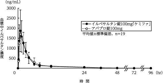 イルベサルタン錠100mg「ケミファ」とアバプロ錠100mgを、クロスオーバー法によりそれぞれ1錠(イルベサルタンとして100mg)健康成人男性に絶食単回経口投与して血漿中イルベサルタン濃度を測定し、得られた薬物動態パラメータ(AUC、Cmax)について90%信頼区間法にて統計解析を行った結果、log(0.80)~log(1.25)の範囲内であり、両剤の生物学的同等性が確認された7)。