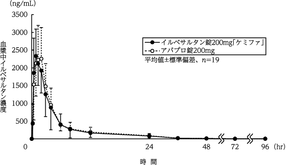イルベサルタン錠200mg「ケミファ」とアバプロ錠200mgを、クロスオーバー法によりそれぞれ1錠(イルベサルタンとして200mg)健康成人男性に絶食単回経口投与して血漿中イルベサルタン濃度を測定し、得られた薬物動態パラメータ(AUC、Cmax)について90%信頼区間法にて統計解析を行った結果、log(0.80)~log(1.25)の範囲内であり、両剤の生物学的同等性が確認された7)。