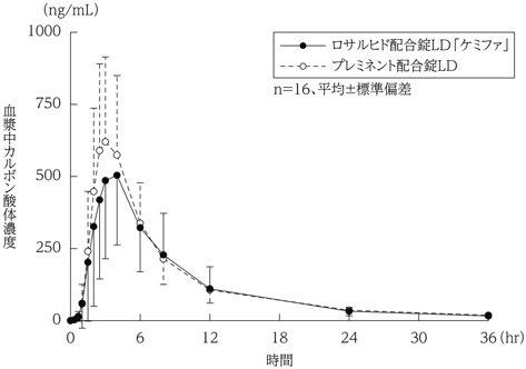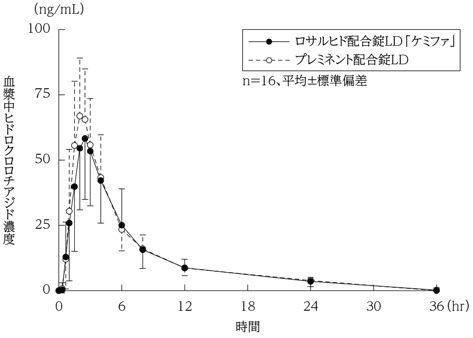 ロサルヒド配合錠HD「ケミファ」は、「含量が異なる経口固形製剤の生物学的同等性試験ガイドライン」に基づき、ロサルヒド配合錠LD「ケミファ」を標準製剤としたとき、溶出挙動が同等と判断され、生物学的に同等とみなされた11)。