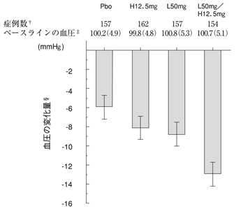Pbo=プラセボ、L=ロサルタンカリウム、H=ヒドロクロロチアジド†主要評価項目のFAS解析対象例、‡平均値(標準偏差)、§最小二乗平均値(95%CI)