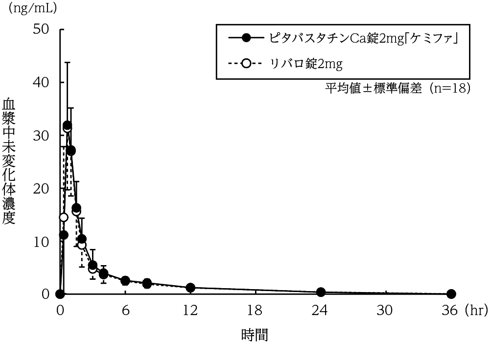 ピタバスタチンCa錠1mg「ケミファ」は、「含量が異なる経口固形製剤の生物学的同等性試験ガイドライン」に基づき、ピタバスタチンCa錠2mg「ケミファ」を標準製剤としたとき、溶出挙動が同等と判断され、生物学的に同等とみなされた3) 。