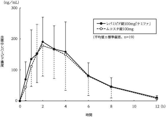レバミピド錠100mg「ケミファ」とムコスタ錠100mgを、クロスオーバー法によりそれぞれ1錠(レバミピドとして100mg)健康成人男性に絶食単回経口投与して血漿中レバミピド濃度を測定し、得られた薬物動態パラメータ(AUC、Cmax)について90%信頼区間法にて統計解析を行った結果、log(0.80)~log(1.25)の範囲内であり、両剤の生物学的同等性が確認された2)。