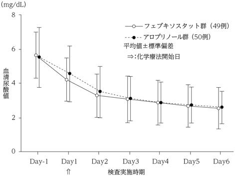 化学療法施行予定の悪性腫瘍患者99例を対象にアロプリノール対照非盲検無作為化比較試験を行った。フェブキソスタット60mg/日又はアロプリノールは300mg/日[腎機能障害のある患者(30≦eGFR<45mL/min/1.73m2)では200mg/日]を化学療法施行開始24時間前から6日間投与した。投与開始6日後までの血清尿酸値AUC(主要評価項目)は、アロプリノール群に対するフェブキソスタット群の非劣性が示された(非劣性マージンは150mg・h/dL)。また、フェブキソスタット60mg/日の投与により血清尿酸値は投与開始6日後まで経時的に減少した29),30)。本試験におけるフェブキソスタット60mg/日の安全性評価対象49例中1例(2.0%)に副作用が認められた。その副作用は、AST増加、ALT増加であった。