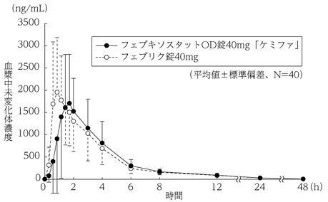 健康成人男性6例に、フェブキソスタットとして40mgを朝食後に1日1回7日間反復経口投与したとき、血漿中フェブキソスタット濃度は投与開始後3日で定常状態に達し、反復投与による蓄積性は認められなかった6)。