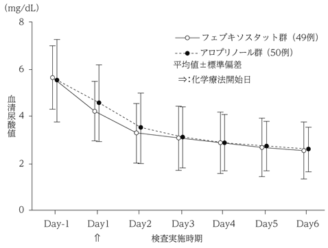 化学療法施行予定の悪性腫瘍患者99例を対象にアロプリノール対照非盲検無作為化比較試験を行った。フェブキソスタット60mg/日又はアロプリノールは300mg/日[腎機能障害のある患者(30≦eGFR<45mL/min/1.73m2)では200mg/日]を化学療法施行開始24時間前から6日間投与した。投与開始6日後までの血清尿酸値AUC(主要評価項目)は、アロプリノール群に対するフェブキソスタット群の非劣性が示された(非劣性マージンは150mg・h/dL)。また、フェブキソスタット60mg/日の投与により血清尿酸値は投与開始6日後まで経時的に減少した29),30)。本試験におけるフェブキソスタット60mg/日の安全性評価対象49例中1例(2.0%)に副作用が認められた。その副作用は、AST増加、ALT増加であった。