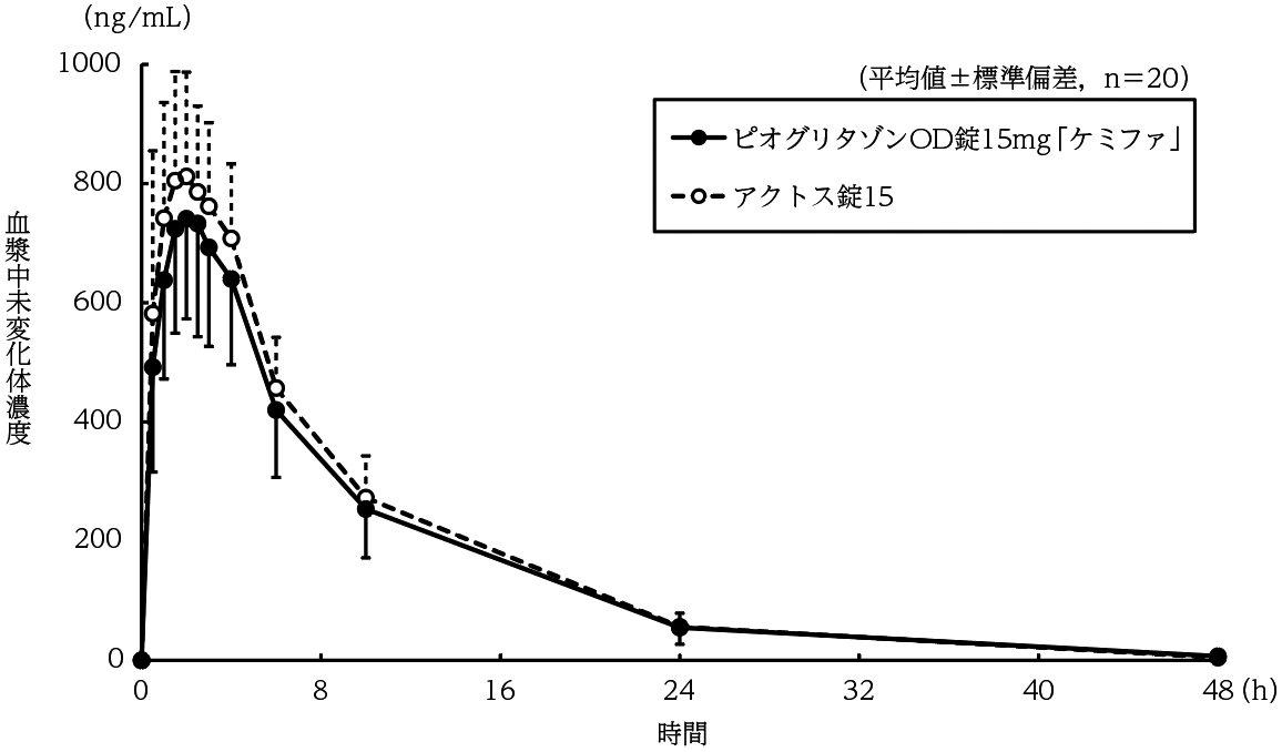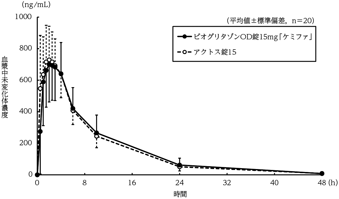 ピオグリタゾンOD錠15mg「ケミファ」とアクトス錠15を、クロスオーバー法によりそれぞれ1錠(ピオグリタゾンとして15mg)健康成人男子に絶食単回経口投与(水で服用及び水なしで服用)して血漿中未変化体濃度を測定し、得られた薬物動態パラメータ(AUC、Cmax)について90%信頼区間法にて統計解析を行った結果、log(0.80)~log(1.25)の範囲内であり、両剤の生物学的同等性が確認された9) 。