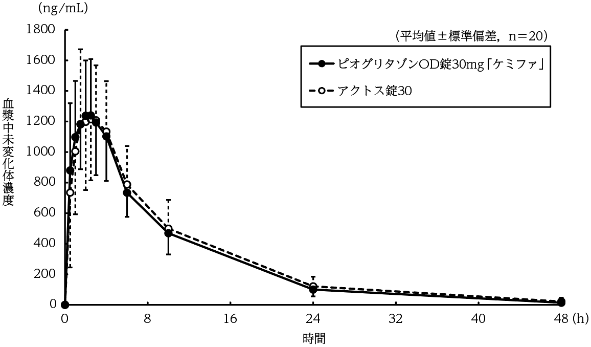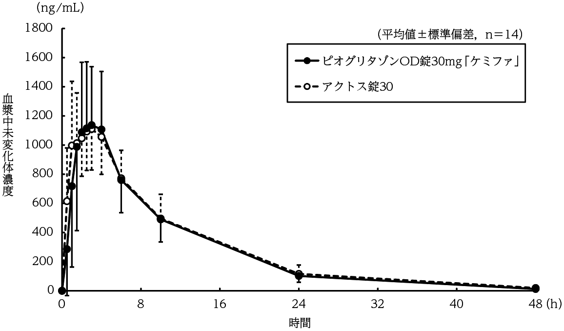 ピオグリタゾンOD錠30mg「ケミファ」とアクトス錠30を、クロスオーバー法によりそれぞれ1錠(ピオグリタゾンとして30mg)健康成人男子に絶食単回経口投与(水で服用及び水なしで服用)して血漿中未変化体濃度を測定し、得られた薬物動態パラメータ(AUC、Cmax)について90%信頼区間法にて統計解析を行った結果、log(0.80)〜log(1.25)の範囲内であり、両剤の生物学的同等性が確認された9) 。