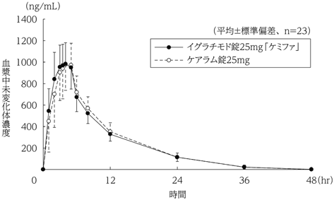 イグラチモド錠25mg「ケミファ」とケアラム錠25mgを、クロスオーバー法によりそれぞれ1錠(イグラチモドとして25mg)健康成人男子に絶食単回経口投与して血漿中未変化体濃度を測定し、得られた薬物動態パラメータ(AUC、Cmax)について90%信頼区間法にて統計解析を行った結果、log(0.80)~log(1.25)の範囲内であり、両剤の生物学的同等性が確認された4)。