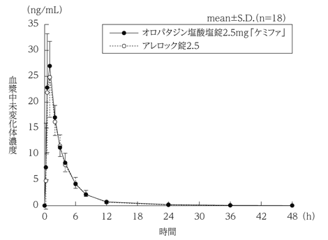 オロパタジン塩酸塩錠2.5mg「ケミファ」とアレロック錠2.5を、クロスオーバー法によりそれぞれ1錠(オロパタジン塩酸塩として2.5mg)健康成人男性に絶食単回経口投与して血漿中未変化体濃度を測定し、得られた薬物動態パラメータ(AUC、Cmax)について90%信頼区間法にて統計解析を行った結果、log(0.80)~log(1.25)の範囲内であり、両剤の生物学的同等性が確認された3)。