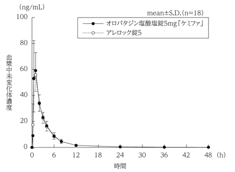 オロパタジン塩酸塩錠5mg「ケミファ」とアレロック錠5を、クロスオーバー法によりそれぞれ1錠(オロパタジン塩酸塩として5mg)健康成人男性に絶食単回経口投与して血漿中未変化体濃度を測定し、得られた薬物動態パラメータ(AUC、Cmax)について90%信頼区間法にて統計解析を行った結果、log(0.80)~log(1.25)の範囲内であり、両剤の生物学的同等性が確認された3)。