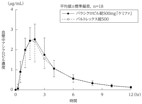 バラシクロビル錠500mg「ケミファ」とバルトレックス錠500を、クロスオーバー法によりそれぞれ1錠(バラシクロビルとして500mg)健康成人男子に絶食単回経口投与して血漿中アシクロビル(活性代謝物)濃度を測定し、得られた薬物動態パラメータ(AUC、Cmax)について90%信頼区間法にて統計解析を行った結果、log(0.80)~log(1.25)の範囲内であり、両剤の生物学的同等性が確認された6)。