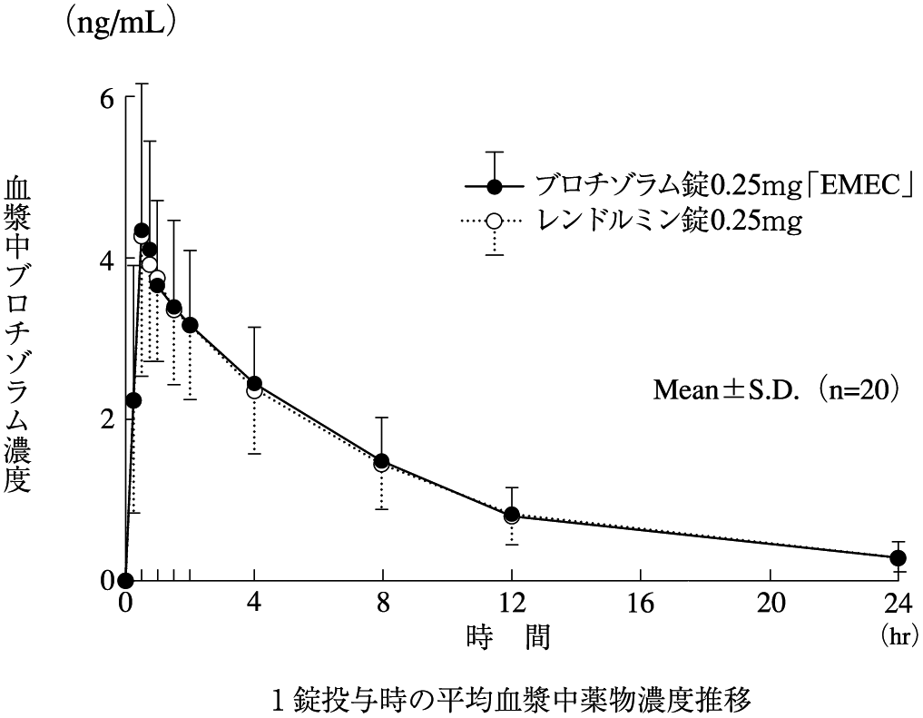 ブロチゾラム錠0.25mg「EMEC」とレンドルミン錠0.25mgを、クロスオーバー法によりそれぞれ1錠(ブロチゾラムとして0.25mg)健康成人男性に絶食下単回経口投与して血漿中のブロチゾラム濃度を測定し、得られた薬物動態パラメータ(AUC、Cmax)について統計解析を行った結果、両剤の生物学的同等性が確認された2) 。