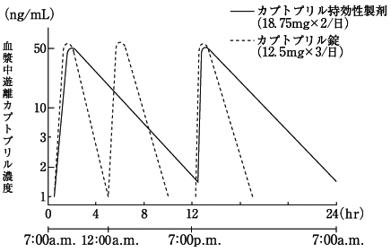 これらの実験より得られた薬物速度論的パラメータを用い、さらに線形性が成立するという仮定の下にカプトプリル持効性製剤とカプトプリル錠との多回投与時の血漿中濃度をシミュレートした結果は図のとおりである5)。