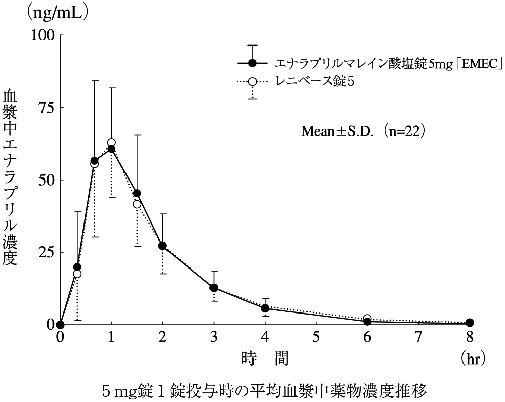 エナラプリルマレイン酸塩錠5mg「EMEC」とレニベース錠5を、クロスオーバー法によりそれぞれ1錠(エナラプリルマレイン酸塩として5mg)健康成人男性に絶食下単回経口投与して血漿中のエナラプリル濃度を測定し、得られた薬物動態パラメータ(AUC、Cmax)について統計解析を行った結果、両剤の生物学的同等性が確認された5) 。