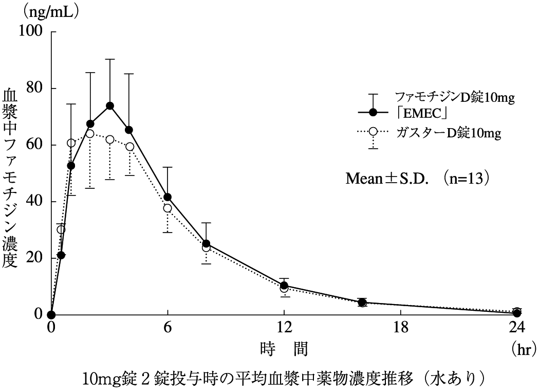 ファモチジンD錠10mg「EMEC」とガスターD錠10mgを、クロスオーバー法によりそれぞれ2錠(ファモチジンとして20mg)健康成人男性に絶食下、水あり及び水なしで単回経口投与して血漿中のファモチジン濃度を測定し、得られた薬物動態パラメータ(AUC、Cmax)について統計解析を行った結果、両剤の生物学的同等性が確認された4) 。