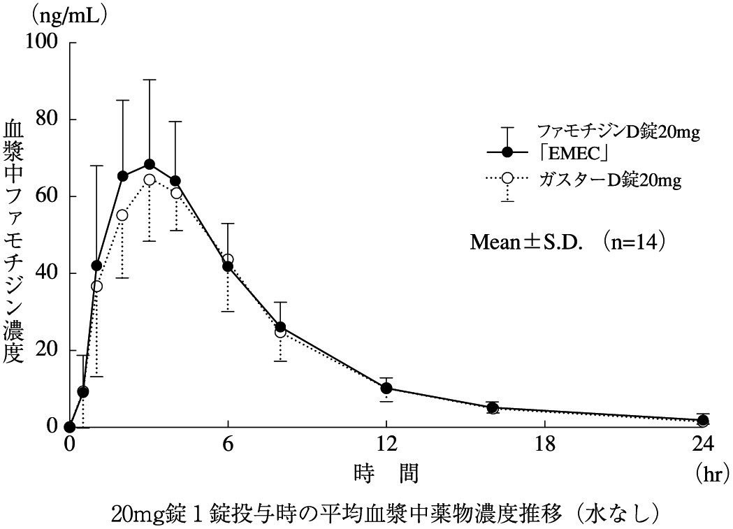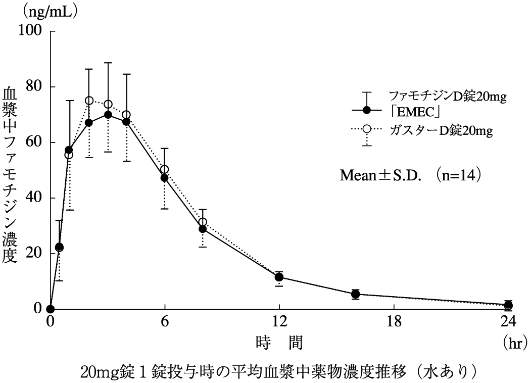 ファモチジンD錠20mg「EMEC」とガスターD錠20mgを、クロスオーバー法によりそれぞれ1錠(ファモチジンとして20mg)健康成人男性に絶食下、水あり及び水なしで単回経口投与して血漿中のファモチジン濃度を測定し、得られた薬物動態パラメータ(AUC、Cmax)について統計解析を行った結果、両剤の生物学的同等性が確認された4) 。