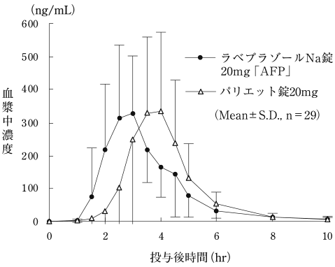 ラベプラゾールNa錠20mg「AFP」とパリエット錠20mgを、クロスオーバー法によりそれぞれ1錠(ラベプラゾールナトリウムとして20mg)健康成人男子29名に絶食単回経口投与して血漿中ラベプラゾールナトリウム未変化体濃度※を測定した。得られた薬物動態パラメータ(AUC、Cmax)について90%信頼区間法にて統計解析を行った結果、log(0.8)~log(1.25)の範囲内であり、両剤の生物学的同等性が確認された3)。※血漿中ラベプラゾール濃度をラベプラゾールナトリウム濃度に換算している。