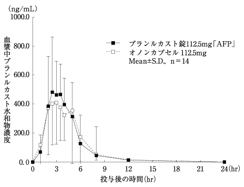 プランルカスト錠112.5mg「AFP」とオノンカプセル112.5mgをクロスオーバー法によりそれぞれプランルカスト水和物として225mg健康成人男子に空腹時単回経口投与して血漿中プランルカスト水和物濃度を測定し、得られた薬物動態パラメータ(AUC、Cmax)について統計解析を行った結果、両剤の生物学的同等性が確認された2)。