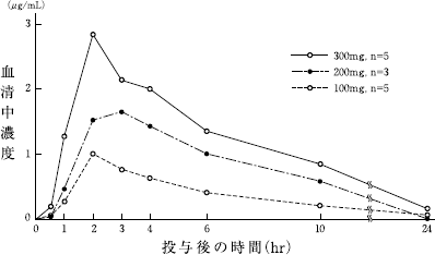 健康成人にオフロキサシンを単回経口投与した場合、血清中濃度は投与量に相関して推移した2),3)。