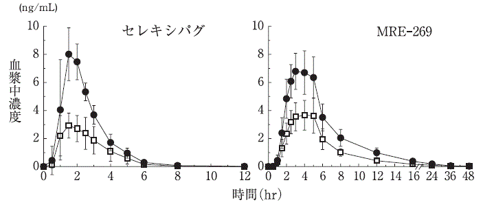 健康成人男性20例に強いCYP2C8の阻害剤であるゲムフィブロジル(国内未承認)600mgを1日2回9日間経口投与し、投与4日目にセレキシパグ0.4mgを単回経口投与したとき、単独投与と比較して、セレキシパグのCmaxは1.4倍、AUC0-∞は2.0倍に増加した。MRE-269のCmaxは3.6倍、AUC0-∞は11倍に増加した10)(外国人データ)。