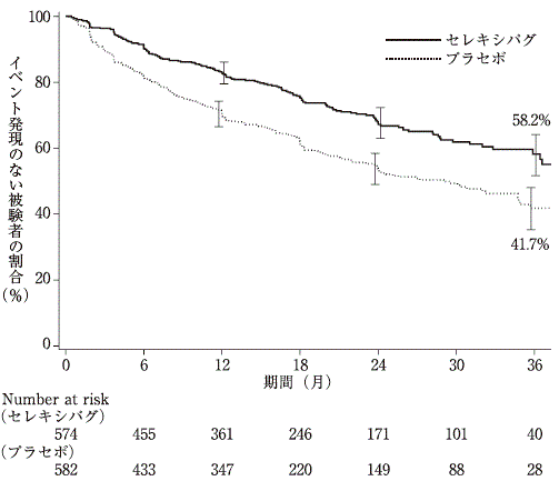 プラセボ対照二重盲検比較試験として、肺動脈性肺高血圧症の患者1156例を対象に、プラセボ又はセレキシパグ0.2~1.6mgを1日2回投与した。有効性主要評価項目である最初のmorbidity/mortalityイベントが発現するまでの期間におけるプラセボ群に対するセレキシパグ群のハザード比は0.60(99%信頼区間:0.46~0.78)であり、セレキシパグ群はプラセボ群と比較してmorbidity/mortalityイベントの発現を有意に低下させた(P<0.0001、片側ログランク検定、有意水準は片側0.005)15),16)。副作用発現頻度は89.6%(575例中515例)であった。主な副作用は、頭痛353例(61.4%)、下痢207例(36.0%)、悪心155例(27.0%)、顎痛143例(24.9%)、筋肉痛80例(13.9%)、嘔吐78例(13.6%)、四肢痛77例(13.4%)、潮紅67例(11.7%)であった。