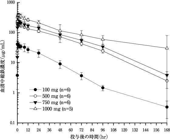 20歳以上65歳未満で体重50kg以上の日本人鉄欠乏性貧血患者24例に、本剤を鉄として100mg又は500mgを約2分かけて単回静脈内投与、750mg又は1000mgを約15分かけて単回点滴静注したときの薬物動態パラメータは以下のとおりであった6)。