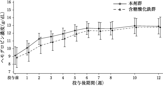 18歳以上の経口鉄剤に忍容性がない若しくは効果不十分、又は急速な鉄補給を必要とする消化管障害に伴う鉄欠乏性貧血患者(ヘモグロビン濃度:11.0g/dL未満、血清フェリチン値:30ng/mL未満(CRPが基準値上限超の場合100ng/mL未満))40例を対象に、患者のヘモグロビン濃度及び体重に応じて総投与鉄量を決定し、本剤を静脈内投与(被験者をA群とB群に3:1の割合でランダム割付)するオープンラベル試験を実施した。A群では初回投与は鉄として500mgとし、その後1日1回最大500mgを1週間に2回の頻度で最小回数により、総投与量を分割して静脈内投与した。B群では初回投与は、1回あたり鉄として最大1000mg(体重50kg未満の場合は20mg/kg)を点滴静注することとし、2回目の投与は、総投与量と初回投与量の差を緩徐に静脈内投与又は点滴静注することとした。投与開始12週後までのヘモグロビン濃度の最大変化量[95%信頼区間]は全体:4.33g/dL[3.82,4.83]、A群(30例):4.27g/dL[3.83,4.71]、B群(10例):4.49g/dL[2.69,6.29]であった11)。投与開始12週後までのヘモグロビン濃度の推移図は以下のとおりであった。