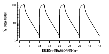 急性白血病患者4例にシタラビン3g/m2/回を12時間毎に3時間持続点滴静脈内投与して得られた薬動学的パラメータを用いてシミュレートした血漿中シタラビン濃度推移を示す4)(外国人データ)。