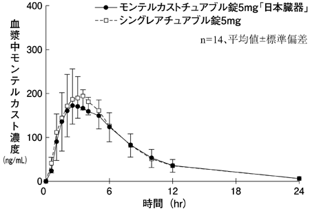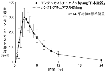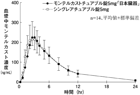 モンテルカストチュアブル錠5mg「日本臓器」とシングレアチュアブル錠5mgをクロスオーバー法によりそれぞれ1錠(モンテルカストとして5mg)健康成人男性にかみくだいて水あり及び水なし、口中で溶かして水あり及び水なしで絶食下単回経口投与を行い、血漿中モンテルカスト濃度を測定した。得られた薬物動態パラメータ(AUC、Cmax)について、90%信頼区間法にて統計解析を行った結果、log(0.80)~log(1.25)の範囲内であり、両剤の生物学的同等性が確認された。6)