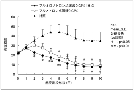 フルオロメトロン点眼液0.02%「日点」とフルメトロン点眼液0.02%の効果を界面活性剤による家兎実験的急性炎症モデルを用いて、Draize法に準じた炎症強度により評価した。分散分析を行った結果、両群に有意差は認められず、生物学的に同等であると判断された9)。