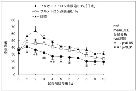 フルオロメトロン点眼液0.1%「日点」とフルメトロン点眼液0.1%の効果をマスタードオイルによる家兎実験的急性炎症モデルを用いて、Draize法に準じた炎症強度により評価した。分散分析を行った結果、両群に有意差は認められず、生物学的に同等であると判断された10)。