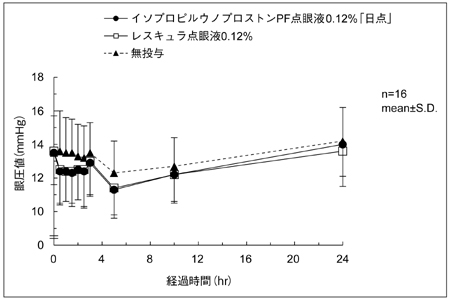イソプロピルウノプロストンPF点眼液0.12%「日点」とレスキュラ点眼液0.12%を健康成人男子を対象としてそれぞれ1滴両眼に点眼し、2群(クロスオーバー法)の眼圧値を測定した。各測定時点の眼圧値及び得られたパラメータ(最高眼圧変化量、眼圧値-時間曲線下面積)について統計解析を行った結果、両剤の生物学的同等性が確認された30)。