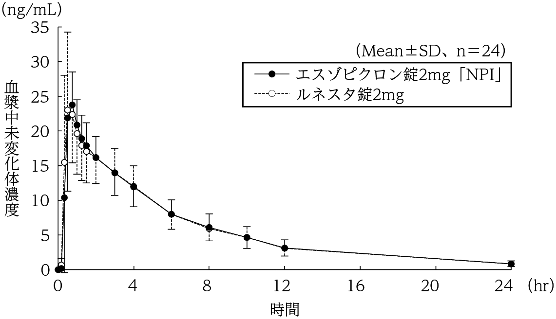 エスゾピクロン錠2mg「NPI」とルネスタ錠2mgを、クロスオーバー法によりそれぞれ1錠(エスゾピクロンとして2mg)健康成人男性に絶食単回経口投与して血漿中未変化体濃度を測定し、得られた薬物動態パラメータ(AUC、Cmax)について90%信頼区間法にて統計解析を行った結果、log(0.80)~log(1.25)の範囲内であり、両剤の生物学的同等性が確認された2) 。