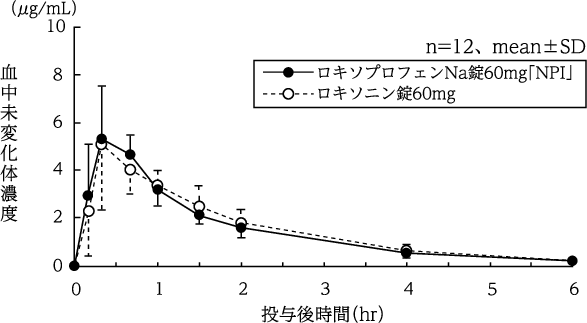 健康成人男性16例にロキソプロフェンナトリウム錠60mgを単回経口投与したところ、速やかに吸収され、血中にはロキソプロフェン(未変化体)のほか、trans-OH体(活性代謝物)の型で存在した。最高血漿中濃度に到達する時間はロキソプロフェンで約30分、trans-OH体で約50分であり、半減期はいずれも約1時間15分であった2)。
