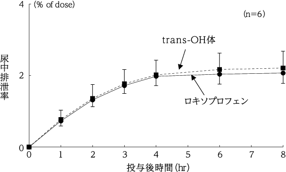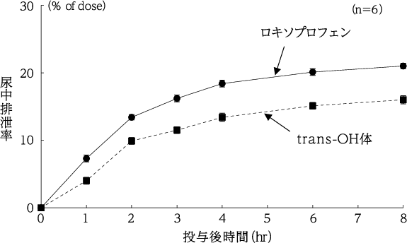 健康成人男性6例にロキソプロフェンナトリウム錠60mgを単回経口投与したとき、尿中への排泄は速やかで、尿中に排泄された大部分がロキソプロフェン又はtrans-OH体のグルクロン酸抱合体であった2)。
